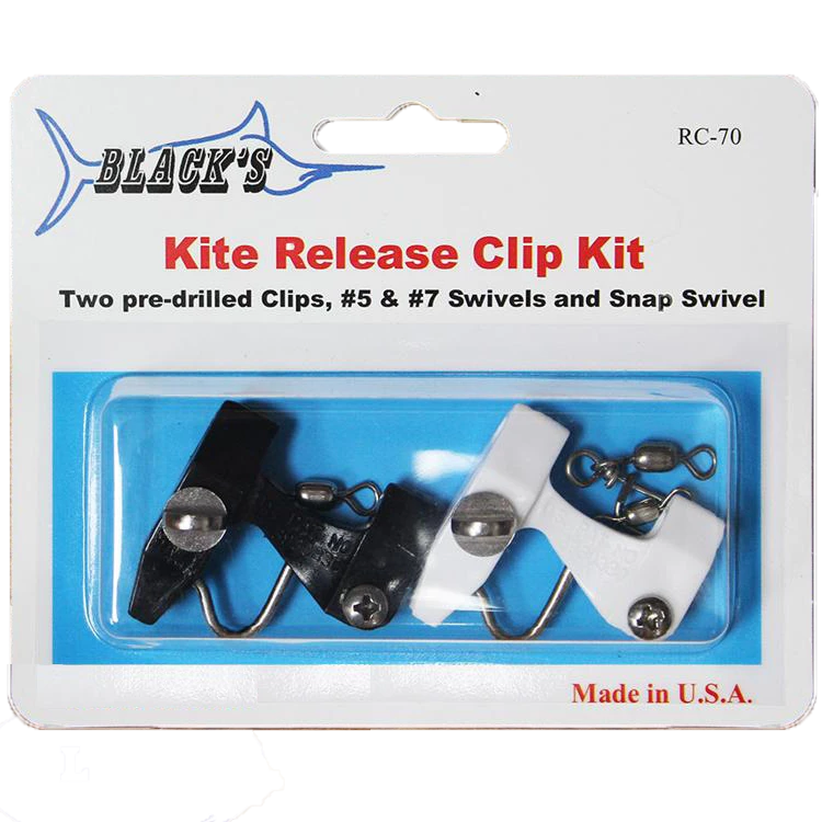 Blacks ‘s Marine Double Kite Release Clip Kit. Two pre-drilled Clips, #5 & #7 Swivels and Snap Swivel. This is referred to as the Black Marine Double Kite Clip kit with swivels. Each clip has a different sized hole for the swivel to catch on. Two Different colors for easy identification of each clip while on the kite line.