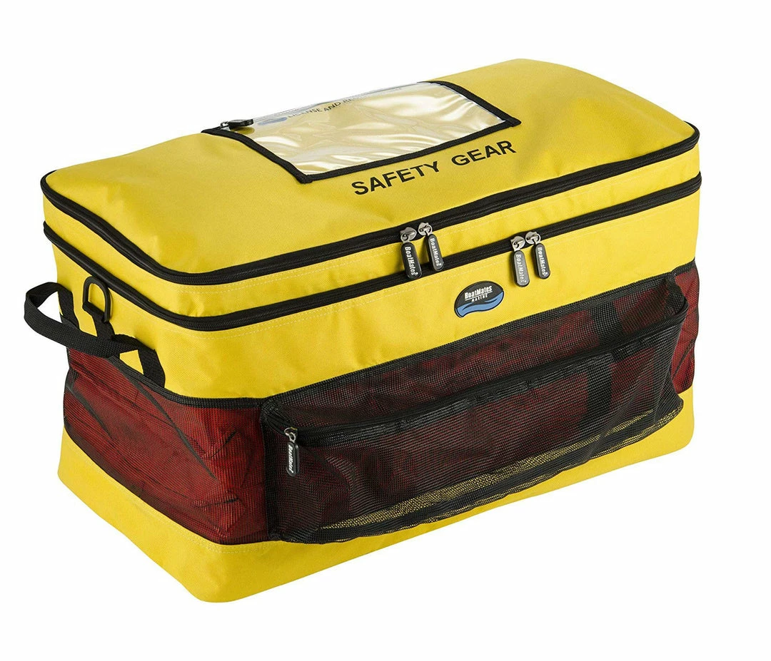 Keep all your mandatory safety and emergency gear organized in this commercial weight, ventilated bag. Holds 4 Adult and child’s pfd’s in main body. Separate storage area in lid holds flares, distress flag, air horn, etc. Large mesh pocket in front for additional storage. Bag has heavy web caring handles, non-skid feet on bottom and grommet openings for drainage. Nylon, self-repairing zippers on bag and lid. D-rings on each end allow bag to be secured to deck on boat or dinghy. Safety equipment not included.