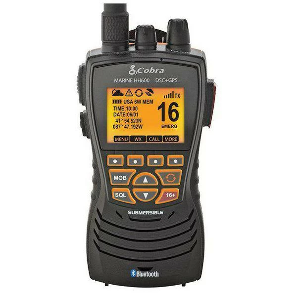 The CobraMarine® MR HH 600 VHF radio with GPS & DSC is Cobra’s first handheld radio that shows your GPS coordinates and automatically transmits them with DSC calls to notify the Coast Guard or other vessels of your exact position in case of emergency.