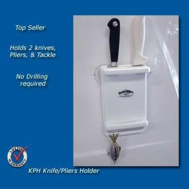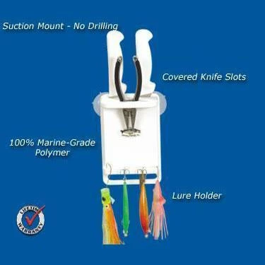 Fisherman’s storage solution! this compact design holds 2 knives in covered slots, pliers, and as many as 20 hooks, lures, and rigs in 9 pre-drilled holes and 4″ slot on bottom of unit. Best of all it is suction cup mounted so there are no holes to drill and is easily movable. Constructed of 100% marine-grade polymer and is available in white or black.