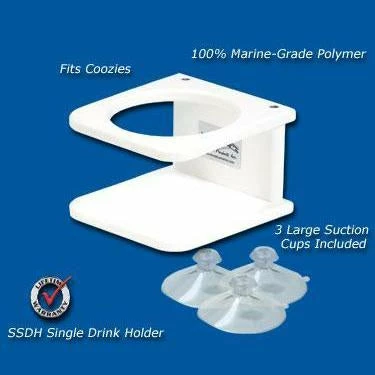 From bass boats to tuna towers this economically priced single drink holder is constructed of 100% marine-grade polymer and includes three suction cups that may be mounted on the back or bottom in pre-drilled holes. Versatile mounting options permit use almost anywhere, may also be permanently attached. Measures 4 1/2″ wide x 4 5/8″ long x 3″ tall. See our complete line of cup holders, we make a version for nearly every occasion. Lifetime warranty.