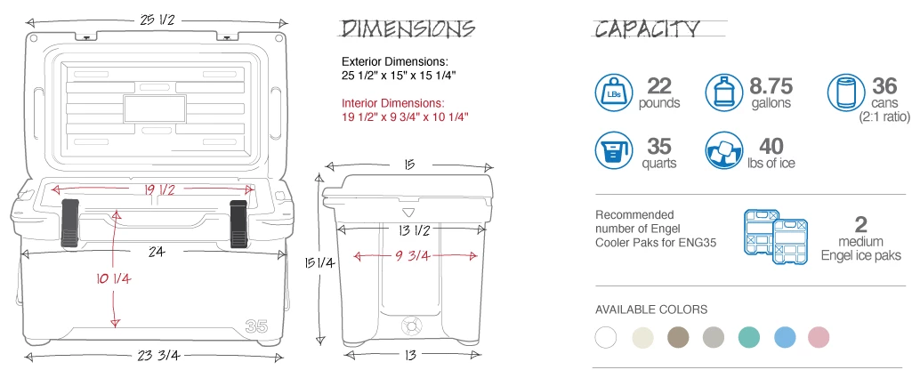 Engel, the original high-performance cooler, is roto-molded for toughness and durability. It’s filled with a full 2 inches of insulation in the lid, on the sides, and on the bottom, helping to retain cold and ice for up to 8 days. The all silicone gaskets create a near airtight seal that is durable and will never lose it’s shape.