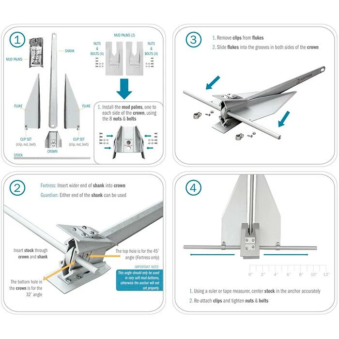Fortress anchors are precision-machined and have interlocking components which are made from a high tensile, corrosion-resistant, aluminum-magnesium alloy. There are no welds to weaken the metal and the result is a lighter, easy to handle anchor with superior holding power.