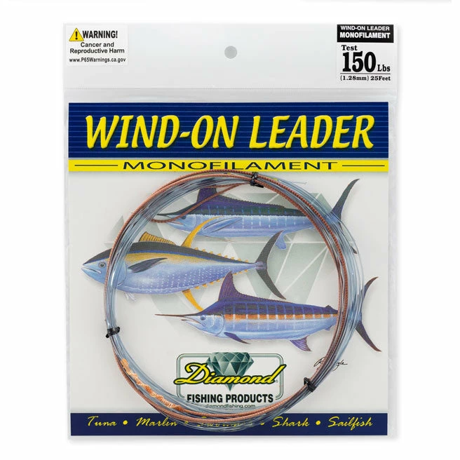 Diamond’s high-strength monofilament and fluorocarbon combined with a low-stretch Dyneema loop creates the strongest, most dependable wind-on leader in the world. Diamond’s Wind-On leaders are attached with a loop-to-loop connection to your fishing line. The wind-on system improves bait presentation, eliminates the need for conventional long leaders, and provides safer handling and releasing of fish at the boat.