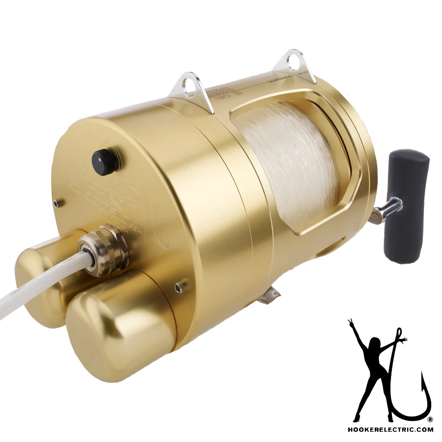 The Hooker Electric Shimano® TI130A Dual Motor was specifically engineered as the ultimate dredge reel and Bluefin Tuna fishing. When used as a dredge reel, it will troll 3-tier mullet rigs without the assistance of a pulley system. It is available in both voltage variants, 12v and 24v. On 12v DC it will pull the line at a rate of 500ft/min and 1,000/ft/min on a 24v DC setup. This beast of a workhorse has a maximum drag of 105lbs which is only limited by the capability of the reel, not the Hooker Electric module. In addition, it harnesses this amount of drag without any loss of speed.