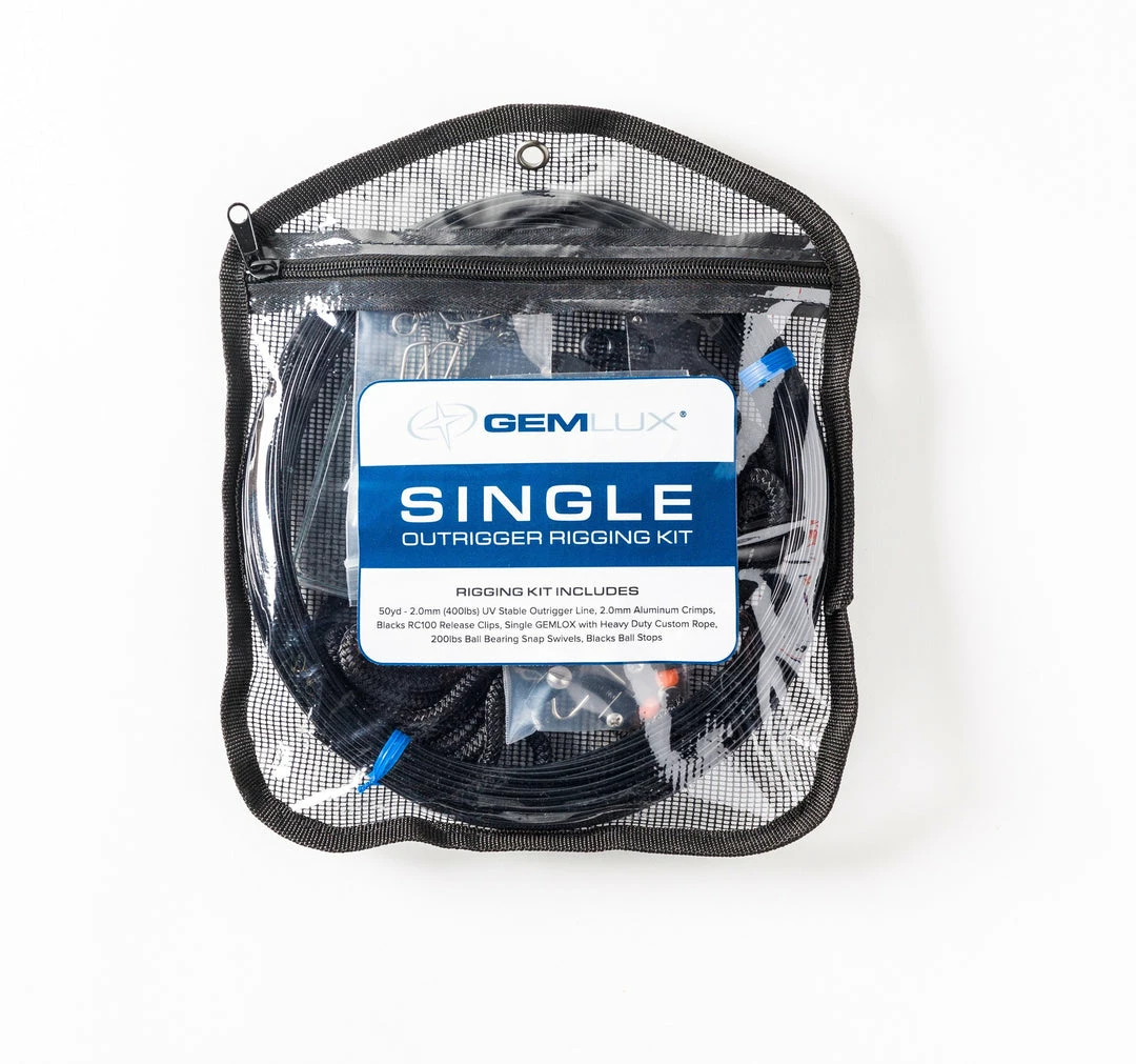 50yd- (400lb) UV Stable Outrigger Line, 2.0mm Aluminum Crimps, Blacks Release Clips, Blacks Ball Stops, 200lb Ball Bearing Snap Swivels, Single GEMLUX with Heavy Duty Custom Rope.