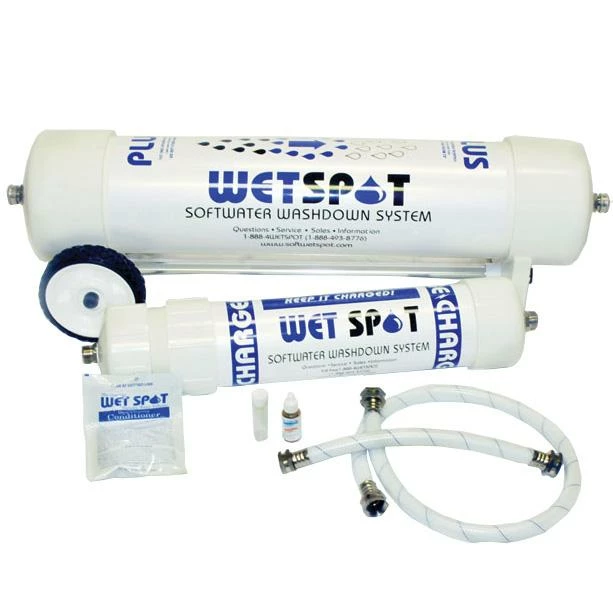 WET SPOT works basically the same way as a residential or commercial water softener, only it’s been designed to be portable and is recharged manually, requiring no electrical hook up! WET SPOT is also designed to last-they are constructed out of strong, low maintenance materials that can withstand even harsh marine environments. PVC, aluminum, brass hose fittings, rubber wheels, even our labels are manufactured of a specialized material.