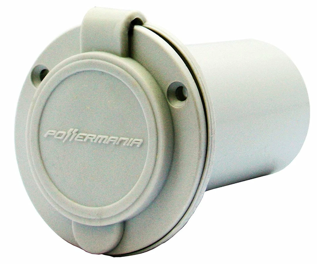 The Powermania AC Plug Port is designed to work with only Powermania chargers’ AC plug. It provides a thru-hull AC connection between the charger and an AC extension cord. The installation does not require any cutting or stripping of the AC cord. The AC Plug Port’s cover seals the AC plug from water and corrosion when it is not in use.