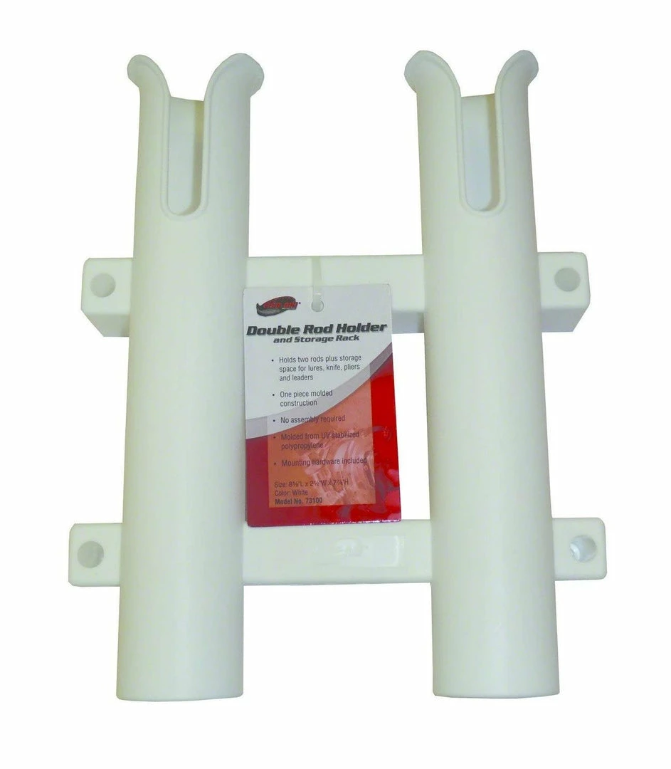Our Fish-On Double Rod Holder and storage rack holds two rods plus storage space for lures, knife, pliers and leaders.